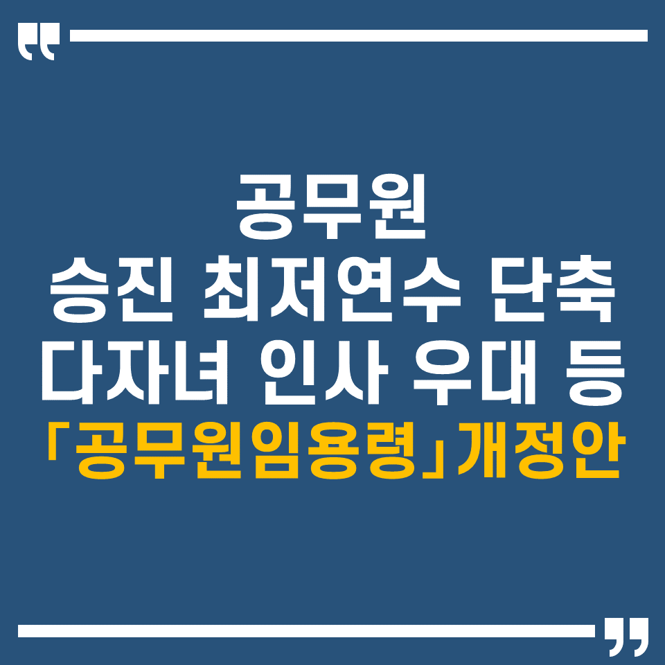공무원 인사를 담당하는 인사혁신처에서 공무원 승진 최저연수 단축 및 다자녀 공무원 인사 우대 등의 사항이 담긴 「공무원임용령」 개정안을 입법예고 했습니다. 이와 관련하여 어떤 내용이 포함되어 있는지 자세히 알아보도록 하겠습니다.