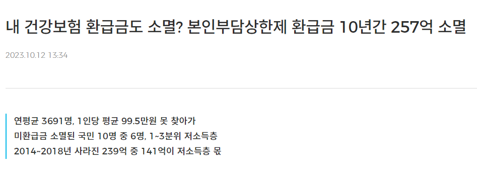 뉴스를 보면 본인부담 환급금이 10년간 257억 소멸되었다고 하니 얼마나 많은 사람들이 못 찾아가고 있는지 가늠할 수 있습니다. 환급금 소멸 시효기간은 3년이므로 주기적으로 조회하셔서 잘 챙기시길 바랍니다.