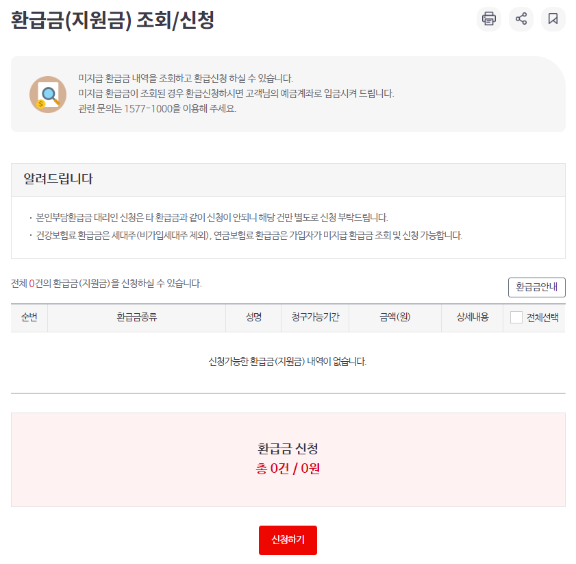 해당 메뉴에 접속하면 미지급 환급금 내역을 조회하고 환급을 신청할 수 있으며 본인 계좌에 입금됩니다. 저는 조회 결과 환급 가능한 내역이 없었지만 만약 본인이 해당된다면 아래 내역에서 확인이 가능합니다.