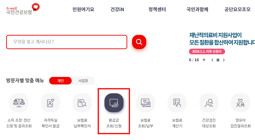 국민건강보험공단 공식 홈페이지에 접속하면 메인화면에 환급금 조회/신청 메뉴로 접속을 합니다. 또는 민원여기요 > 개인민원 > 환급금(지원금) 조회/신청 경로를 통해서도 접속할 수 있습니다.