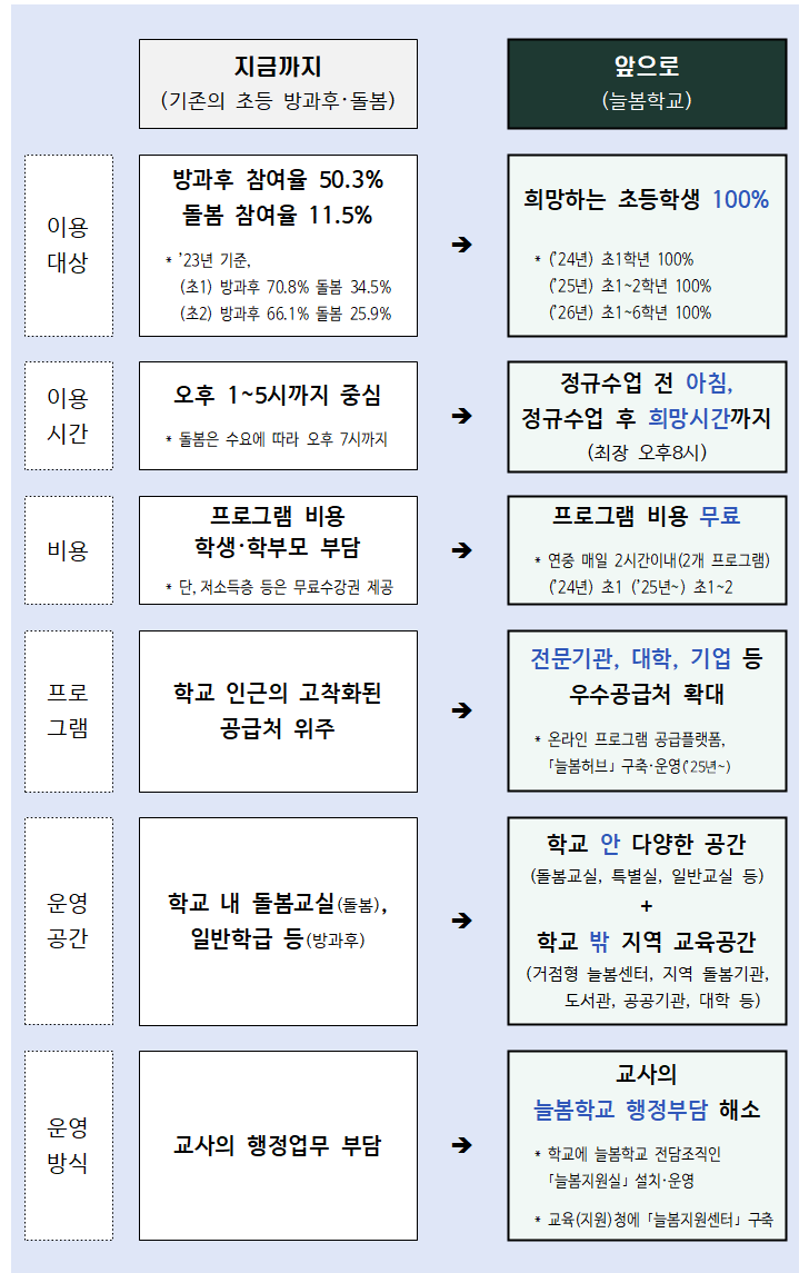 늘봄학교 관련 내용을 표로 정리하면 아래와 같습니다.
