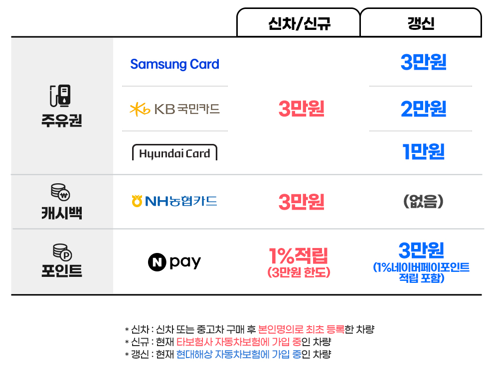 현대해상에서는 신차/신규, 갱신으로 구분하여 30만원 이상 보험료 결제 시, 주유권, 캐시백, 네이버페이 포인트를 받을 수 있습니다.