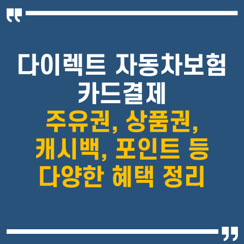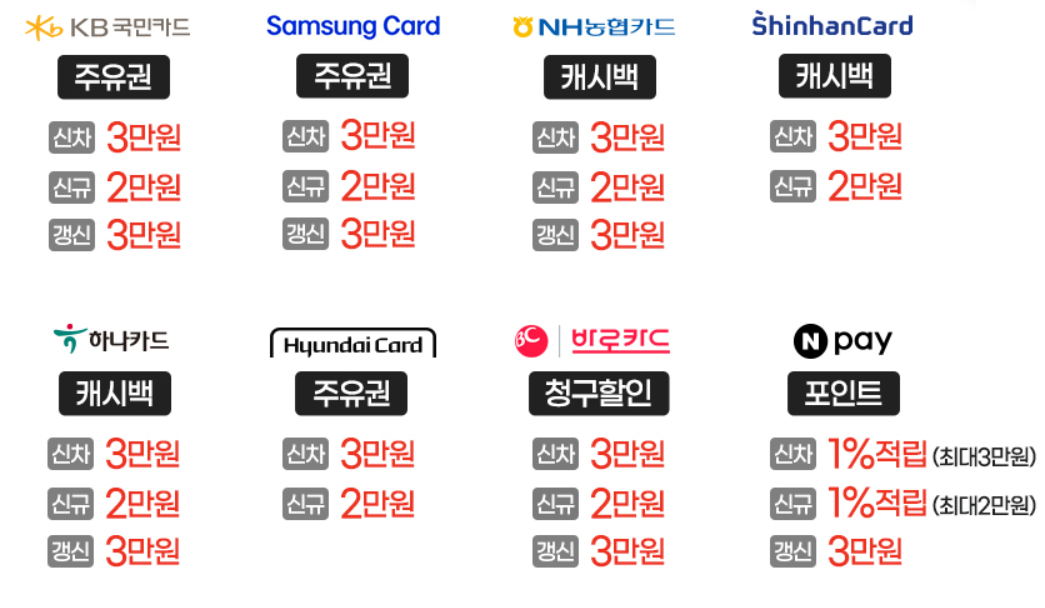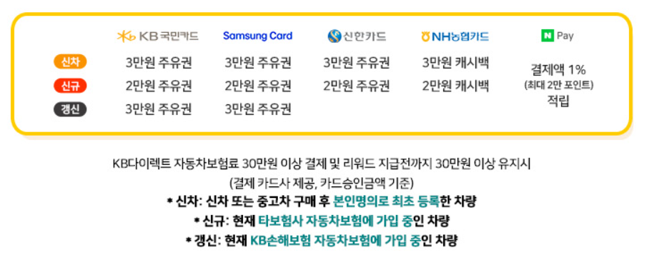 다이렉트 자동차보험 견적 조회, 갱신할 때 현금 및 포인트를 챙길 수 있는 이벤트에 이어, 후속편으로 자동차보험 결제 시 카드사에 따라 주유권, 상품권, 캐시백 등 혜택을 받을 수 있는 이벤트에 대해서 알아보겠습니다.