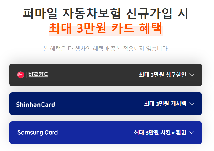 다이렉트 자동차 보험사를 정하고 결제를 진행할 때, 삼성, 신한, KB, 현대 등 카드를 사용하면 상품권, 주유권, 캐시백(현금), 포인트 등을 받을 수 있는 혜택이 있습니다.