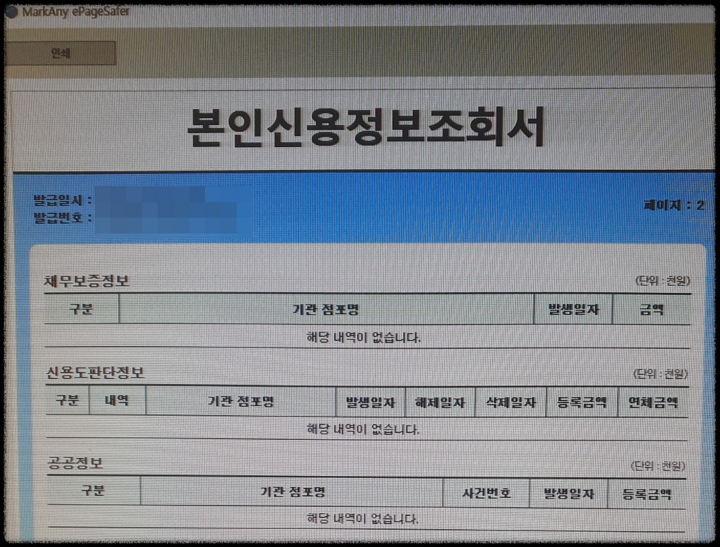 신용정보조회서에는 주민등록번호 및 성명의 개인정보와 대출이나 연체정보, 카드개설 및 발급내역, 채무보증내역, 신용도판단정보, 공공정보가 포함되어 있는 아주 민감한 문서입니다. 따라서 문서를 열람하거나 출력할 때 철저한 관리가 필요합니다.