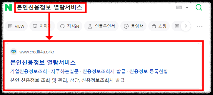 '본인신용정보 열람서비스'를 검색하면 아래와 같이 크레딧포유 사이트가 나옵니다.
