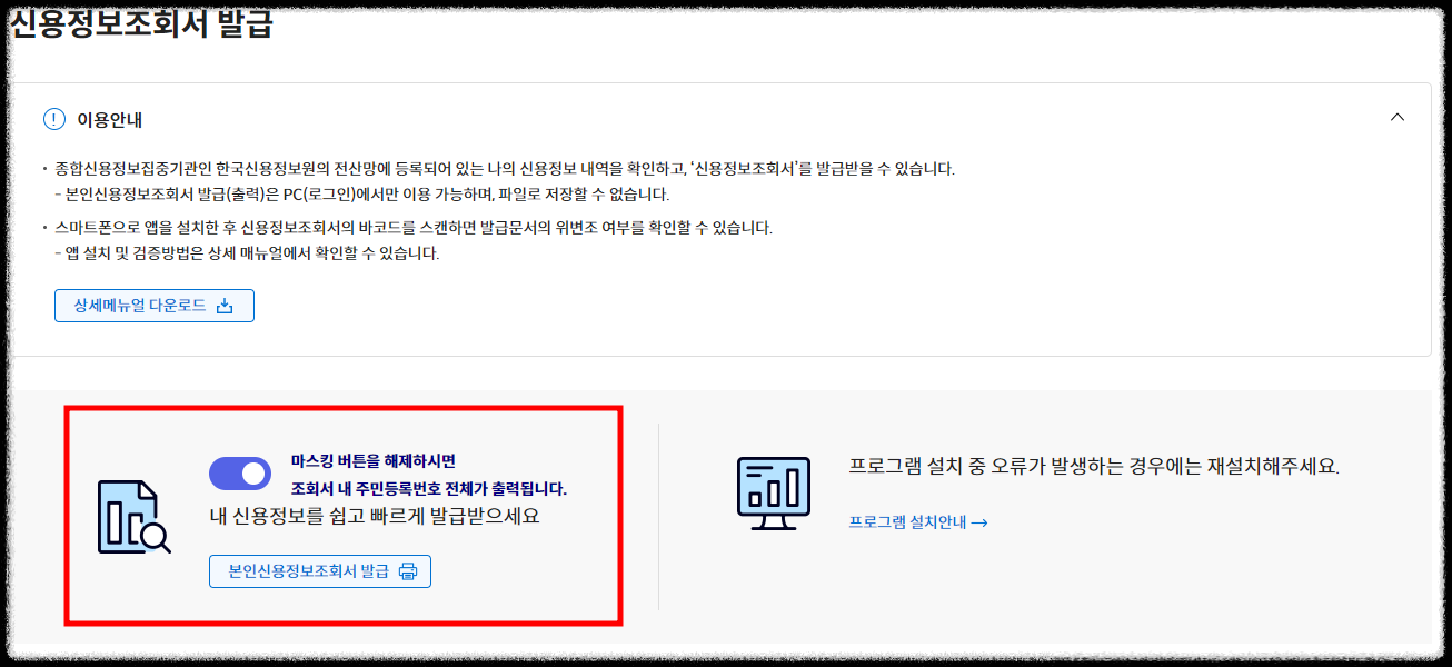 다음 화면에서 본인신용정보조회서 발급을 누르면 본인신용정보조회서를 바로 확인할 수 있습니다.