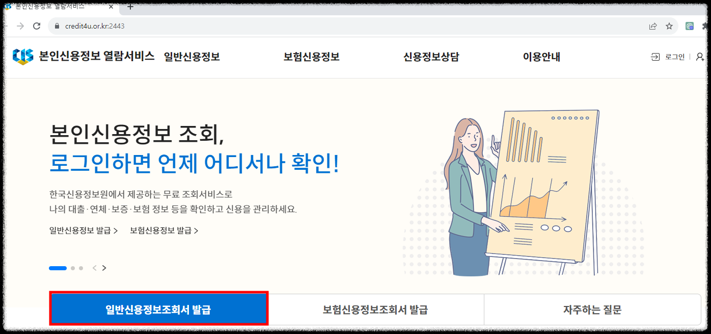 해당 사이트에 접속하여 메인화면에서 일반신용정보조회서 발급 메뉴를 선택합니다. 민감한 개인정보가 포함되어 있는 문서인 만큼 비회원은 열람이 불가하여 사전 회원가입과 로그인은 필수입니다.