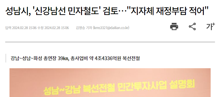 지하철 노선 신설은 부동산 가격, 직장, 교통 등 우리 삶에 많은 영향을 미치는 부분입니다. 이와 관련하여 성남시에서 가칭 신강남선 민자 철도 사업 검토 계획을 밝혀 노선 및 수혜지를 정리해 보도록 하겠습니다.