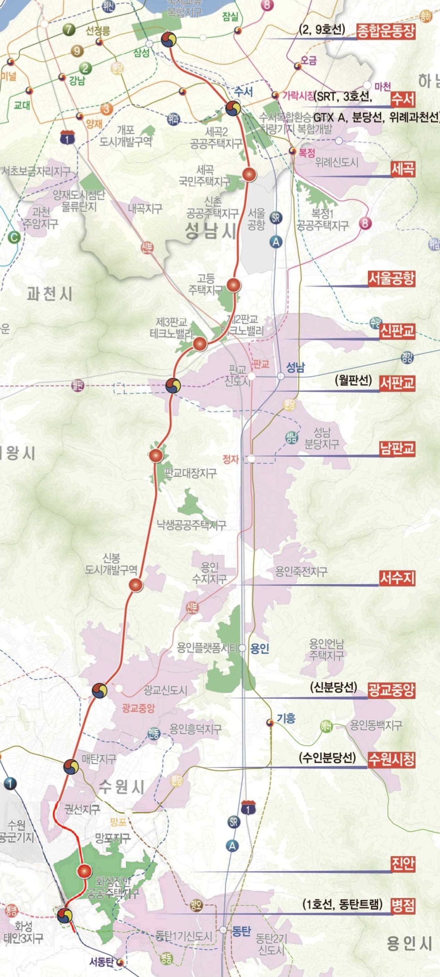 노선도를 살펴보면 서울부터 경기도의 성남, 용인, 수원, 화성이 수혜지역으로 떠오릅니다. 지역별로 그 내용일 알아보도록 하겠습니다.
