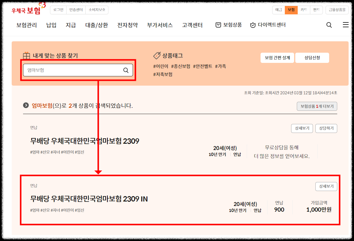 우체국 보험 홈페이지의 메인 페이지에서 '엄마보험' 상품을 검색하여 '무배당 우체국 대한민국 엄마보험 2309 IN' 을 선택합니다.