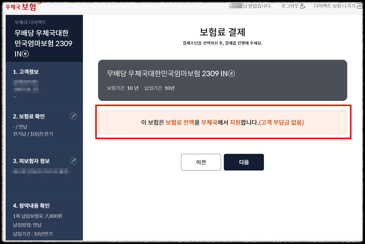보험료 결제 단계에서 보험료 전액 우체국에서 지원(고객 부담금 없음) 문구를 확인할 수 있습니다.