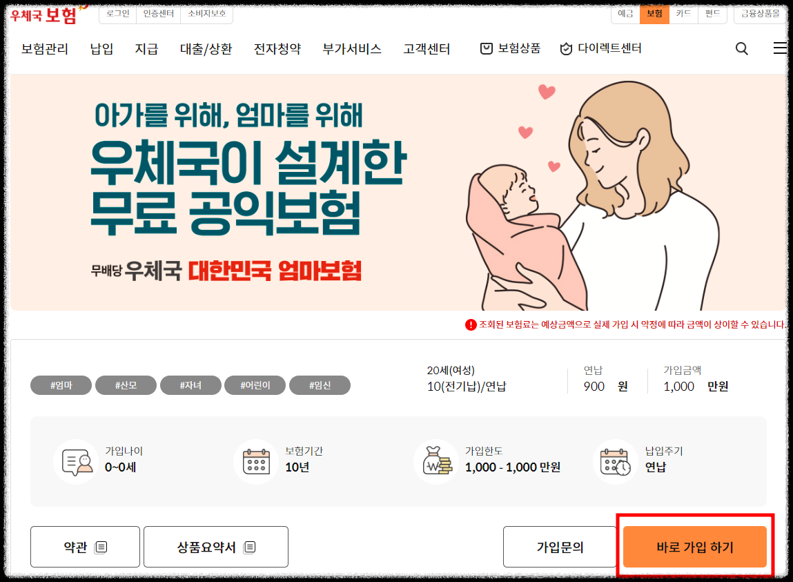 무료로 가입 가능한 정부지원의 공익보험인만큼 산모라면 필수적으로 가입하시길 추천드리며, 최대한 빨리 가입하셔서 22주 이내 산모 특약까지 알뜰하게 챙기시길 바랍니다.