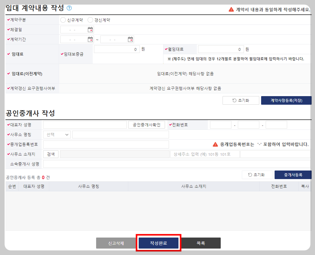 계약구분, 계약기간, 임대료 등 계약내용과 공인중개사 정보를 작성합니다. 기본적인 정보를 다 입력했다면 맨 하단의 '작성완료' 버튼을 눌러줍니다.