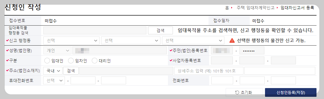 기본적으로 신청인 정보를 작성하고 하단의 '신청인등록(저장)'을 눌러줍니다.