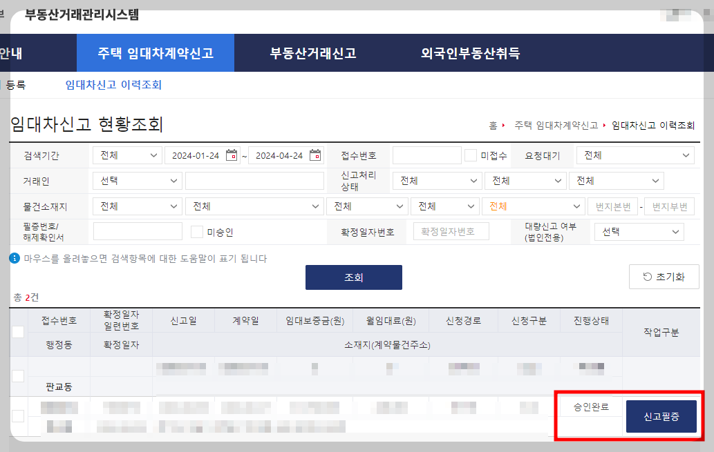 행정복지센터에서 승인이 완료되면 진행상태가 '승인완료'로 바뀌게 됩니다. 그러면 주택 임대차계약신고 이력조회 메뉴에서 '신고필증'을 출력할 수 있습니다.