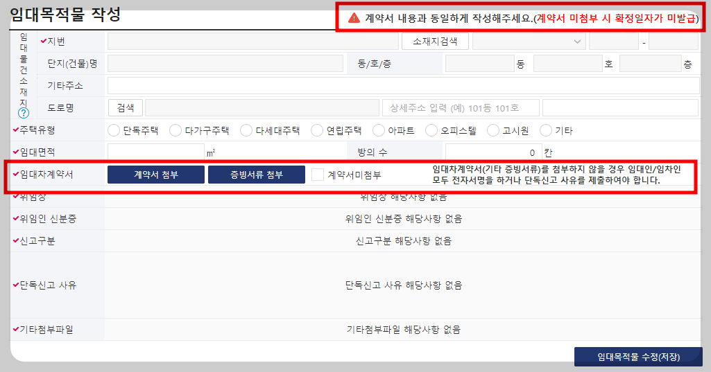 임대목적물 정보를 계약서 내용과 동일하게 작성해 주세요. 임대차 계약서를 미첨부할 경우 확정일자가 미발급되니 꼭 첨부하시기 바랍니다.