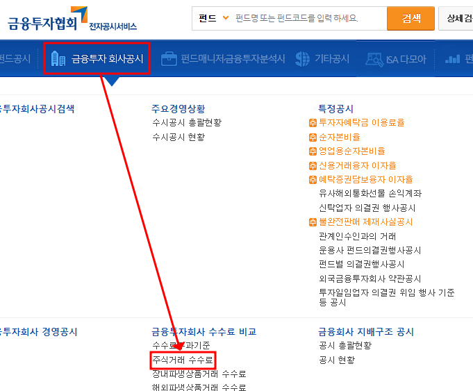 먼저 해당 홈페이지 접속하여 금융투자 회사공시 > 주식거래 수수료로 들어갑니다.