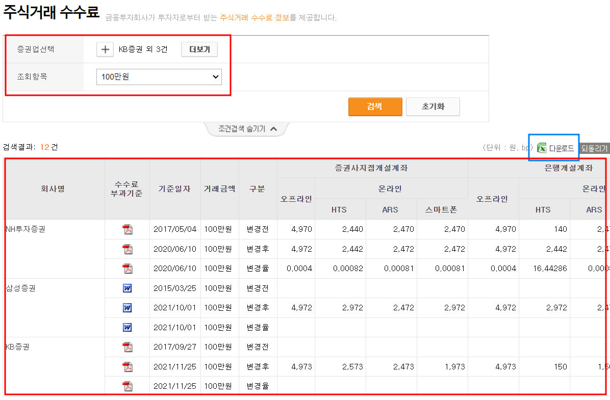 해당 페이지에 접속하면 증권사와 기준금액을 선택하여 증권사별 수수료를 간편하게 비교할 수 있습니다. 추가로 엑셀로 다운로드하여 수수료 기준으로 정렬하면 가장 저렴한 증권사를 바로 확인할 수 있습니다.