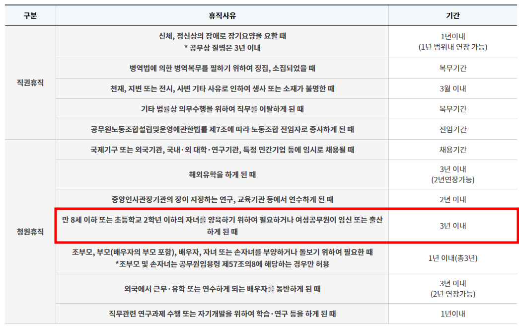 공무원은 아래의 휴직사유에 따라 자녀 1명당 3년까지 육아휴직을 사용할 수 있습니다. 주어진 3년은 분할하여 사용할 수 있으며, 부부 공무원의 경우라도 각각 3년을 쓸 수 있습니다.