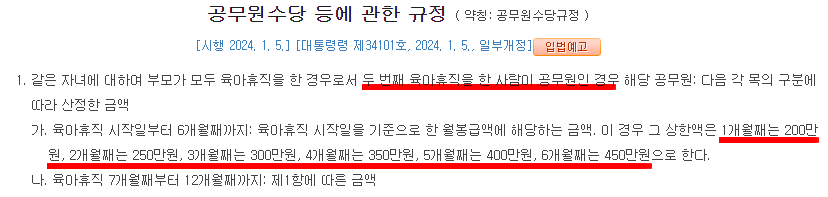 이번 개정안에 따르면 같은 자녀에 대해 부모 모두 육아휴직을 한 경우 두 번째 육아휴직자가 공무원이라면 시작일부터 6개월까지 상한액이 200만원에서 450만원까지 확대됩니다.