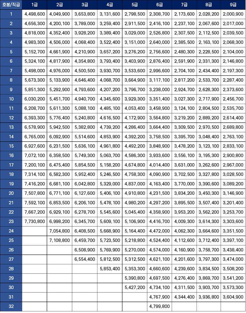 인사혁신처에서 발표한 최종 확정된 2025 공무원 봉급표는 다음과 같습니다. 9급 1호봉은 2,000,900원으로 처음으로 200만 원을 넘어선 것이 눈에 띕니다.