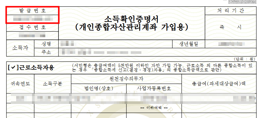위의 소득확인증명서의 발급번호를 계좌를 개설한 증권사 앱에 입력합니다. 자세한 절차는 증권사마다 차이가 있을 수 있으므로 해당 증권사 고객센터를 통해 확인하시기 바랍니다.
