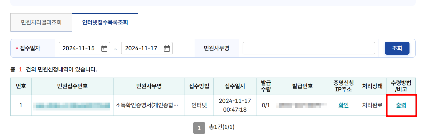발급을 받고 출력 버튼을 눌러 문서 내용을 확인합니다.