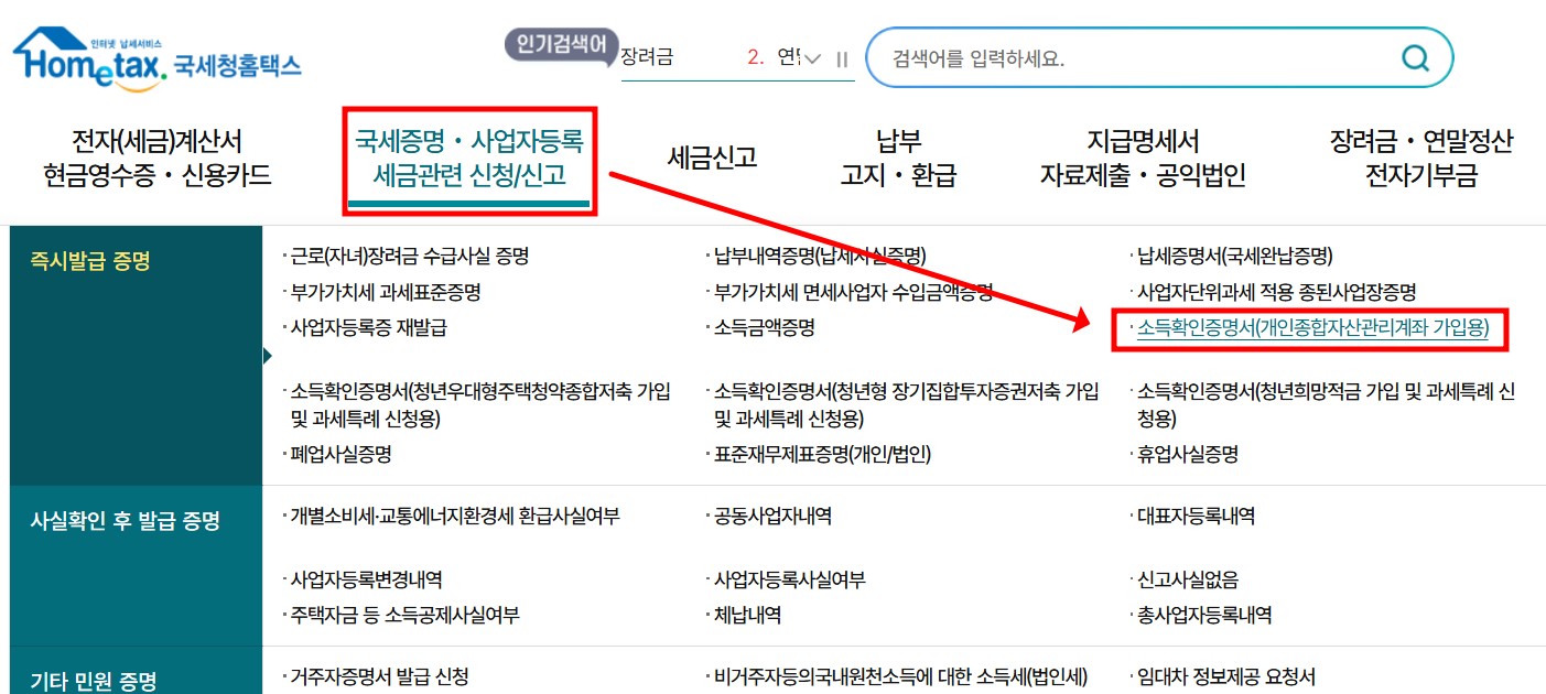 먼저 국세청 홈택스에서 '소득확인증명서(개인종합자산관리계좌 가입용)'를 발급받습니다.